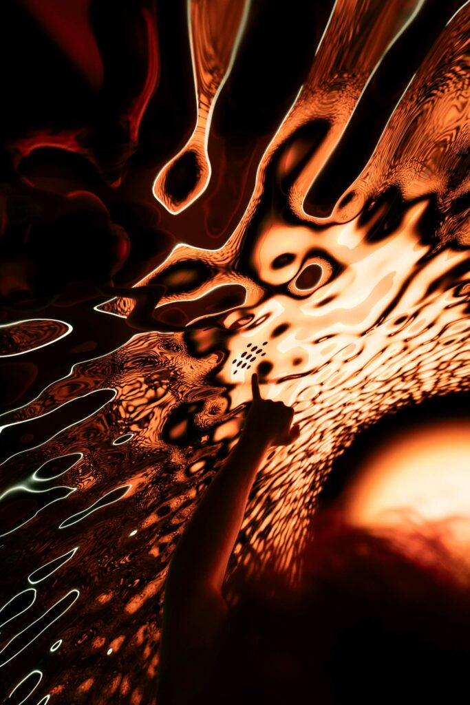 In collaboration with the project’s architects from Atelier522, a series of material experiments with mirrors and metallic surfaces led to the development of a tunnel-like structure: a custom-built half cylinder of mirrored stainless steel designed to mimic the reflective qualities of water. At its far end, an 8K LED wall projects dynamic imagery that ripples through infinite reflection.