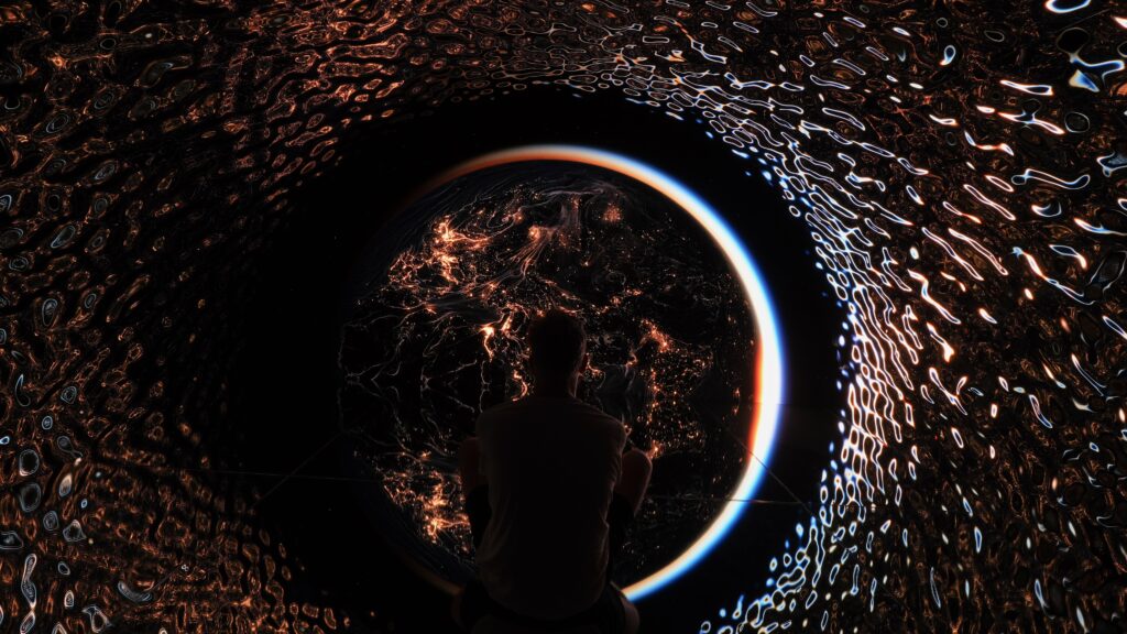 Within the tube, the audience witnesses Earth slowly rotating in space, a perspective known to evoke the ‘overview effect’, a transformative cognitive shift reported by astronauts when viewing our planet from orbit. This perspective shift reveals how breath dissolves boundaries: between inner and outer worlds, between self and other. Through this lens, the illusion of separation falls away, and the shared fabric of existence comes into view.