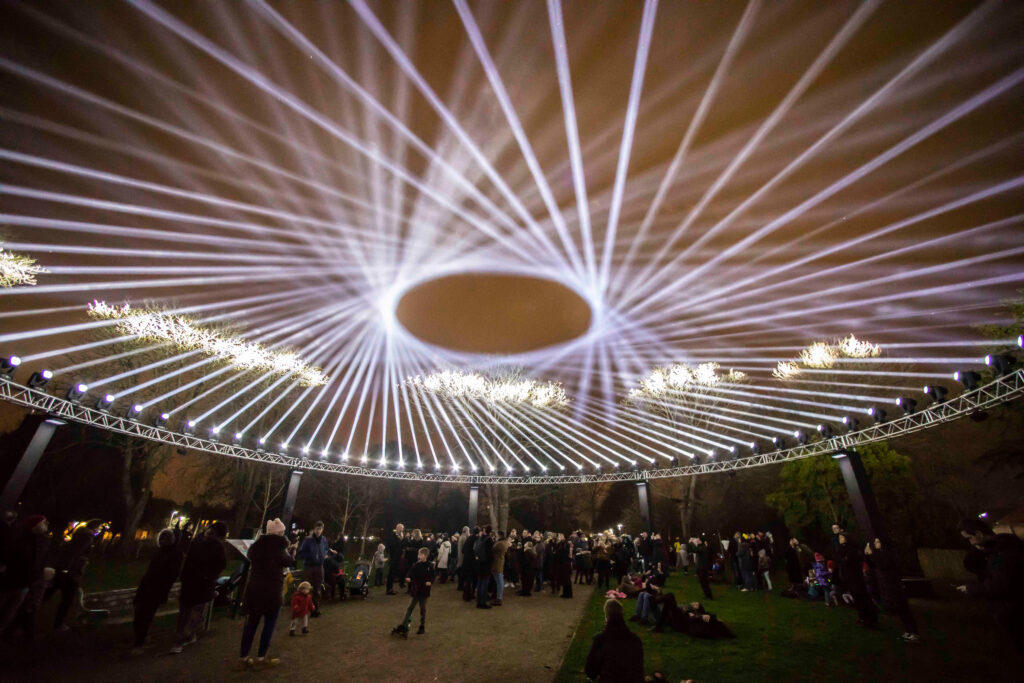 NEST is a large-scale kinetic light sculpture commissioned by the Mayor of London for the launch of Waltham Forest London Borough of Culture 2019. Conceived as a luminous gathering place, NEST acts as a beacon that brings a community together in a playful environment and draws upon principles from perceptual research to explore how the eye gathers depth, form and motion cues to construct our sense of space.