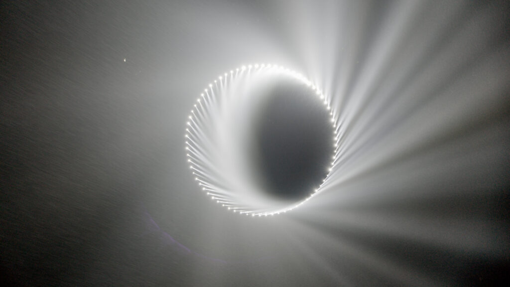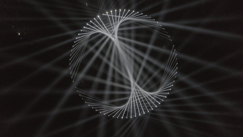 NEST is constructed from a thirty meter diameter circular array of moving head lights and a spatialised audio system, all of which is raised 4 meters off the ground. The audience can walk in and around the structure. When entering the circle, they are met with a mesmerising experience of kinetic light and sound.